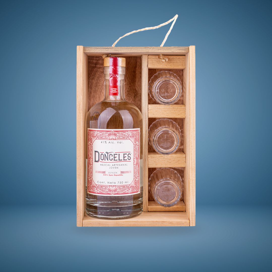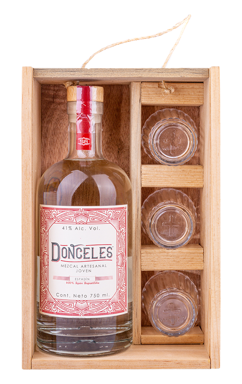 Incluye una botella de 750 ml de Mezcal Donceles Espadín y 3 vasitos veladora para mezcal