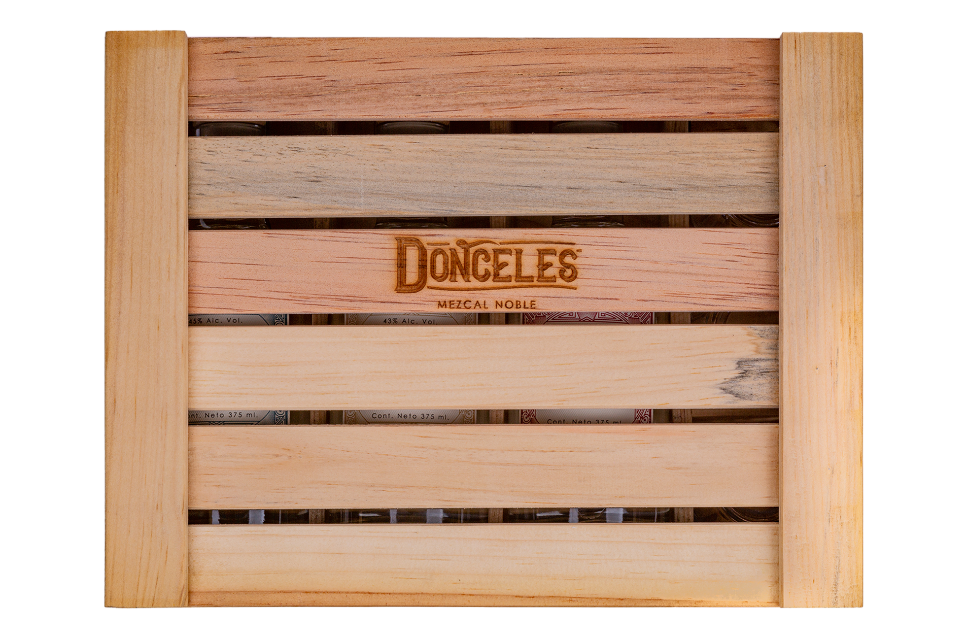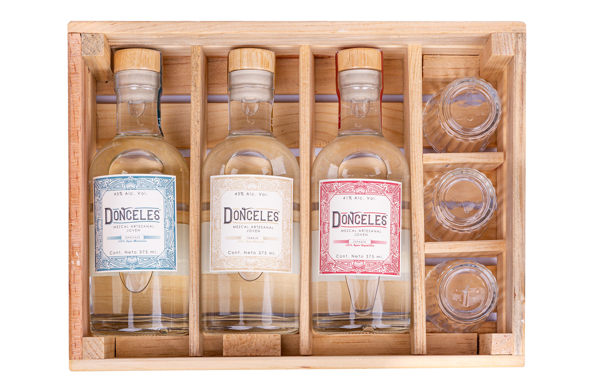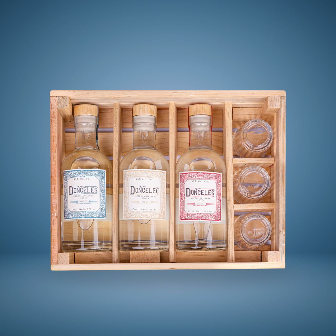 Incluye 3 botellas de 375 ml de Mezcal Donceles (Espadín, Tobalá y Tepeztate ) y 3 vasitos veladora para mezcal